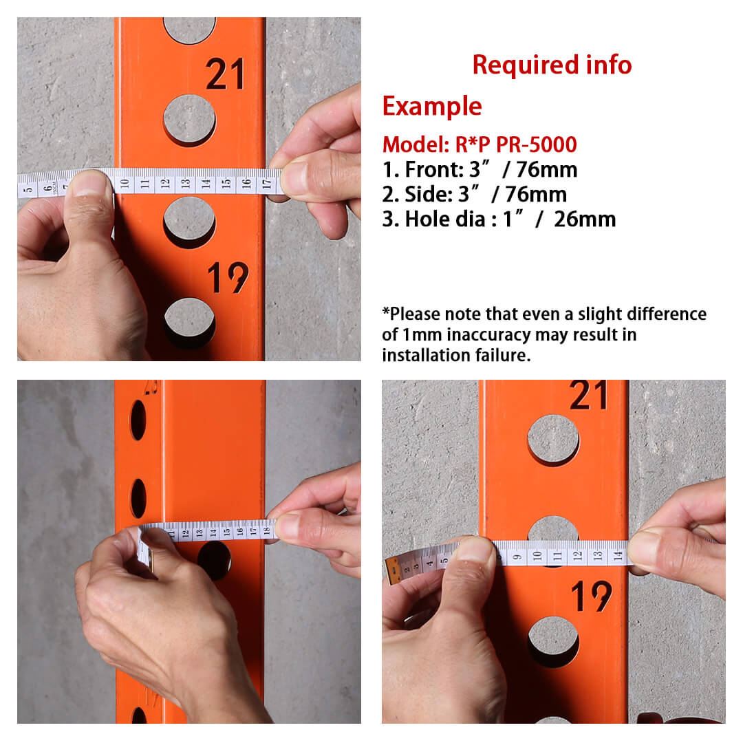 If your power rack is from a well-known brand, please provide the model number. If not, follow the guide below to measure your upright and send us the measurements along with photos for confirmation. Otherwise, we cannot ship your order, as even a 1mm discrepancy may lead to installation failure.
